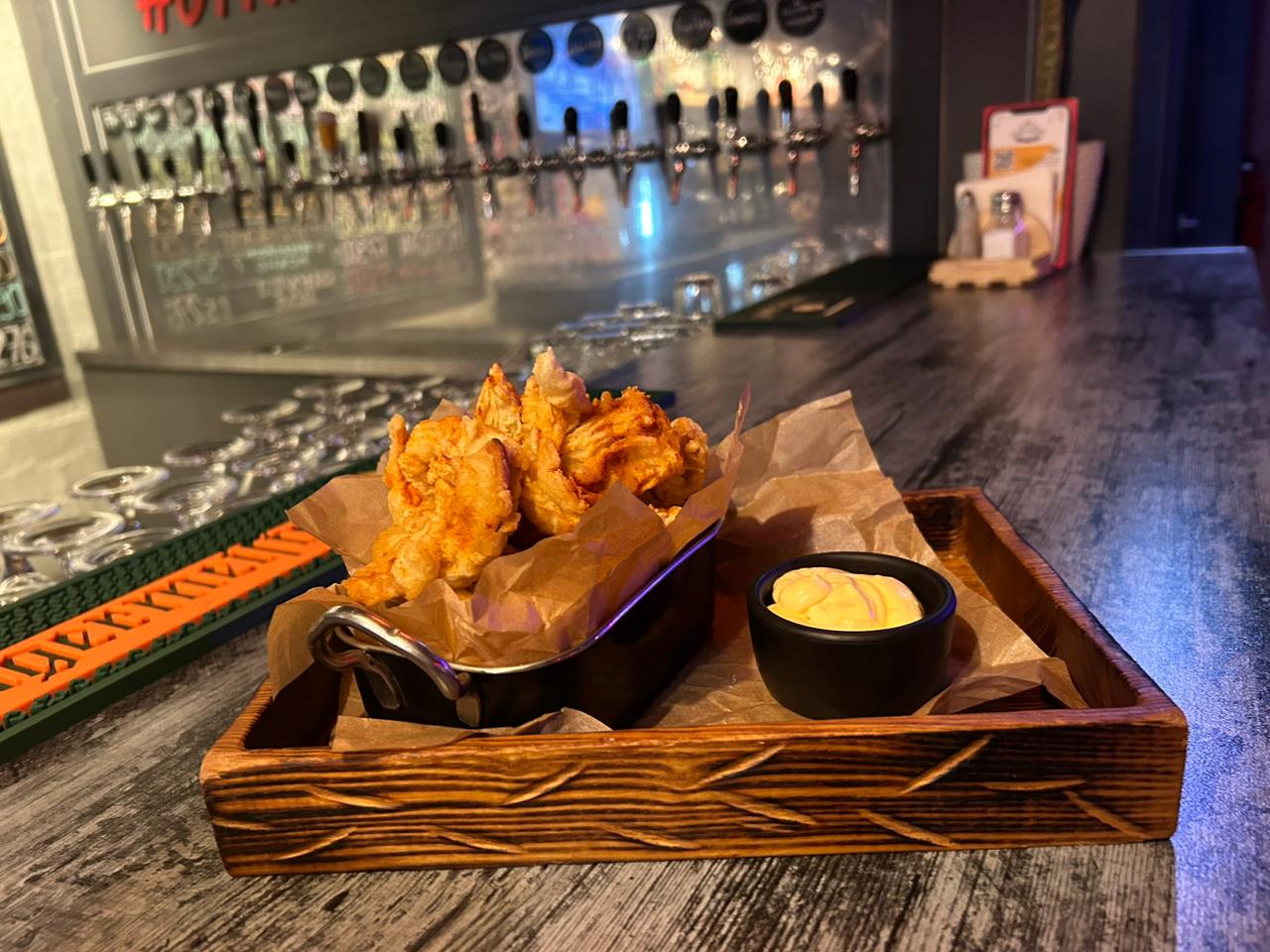 Кольца кальмара, кольца луковые, гренки с сыром, чипсы куриные, чипсы из телятины, моцарелла жареная, картофель фри, 3 соуса