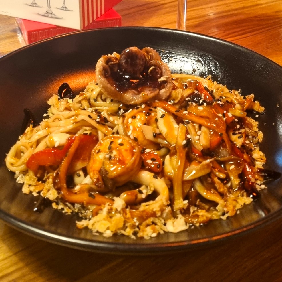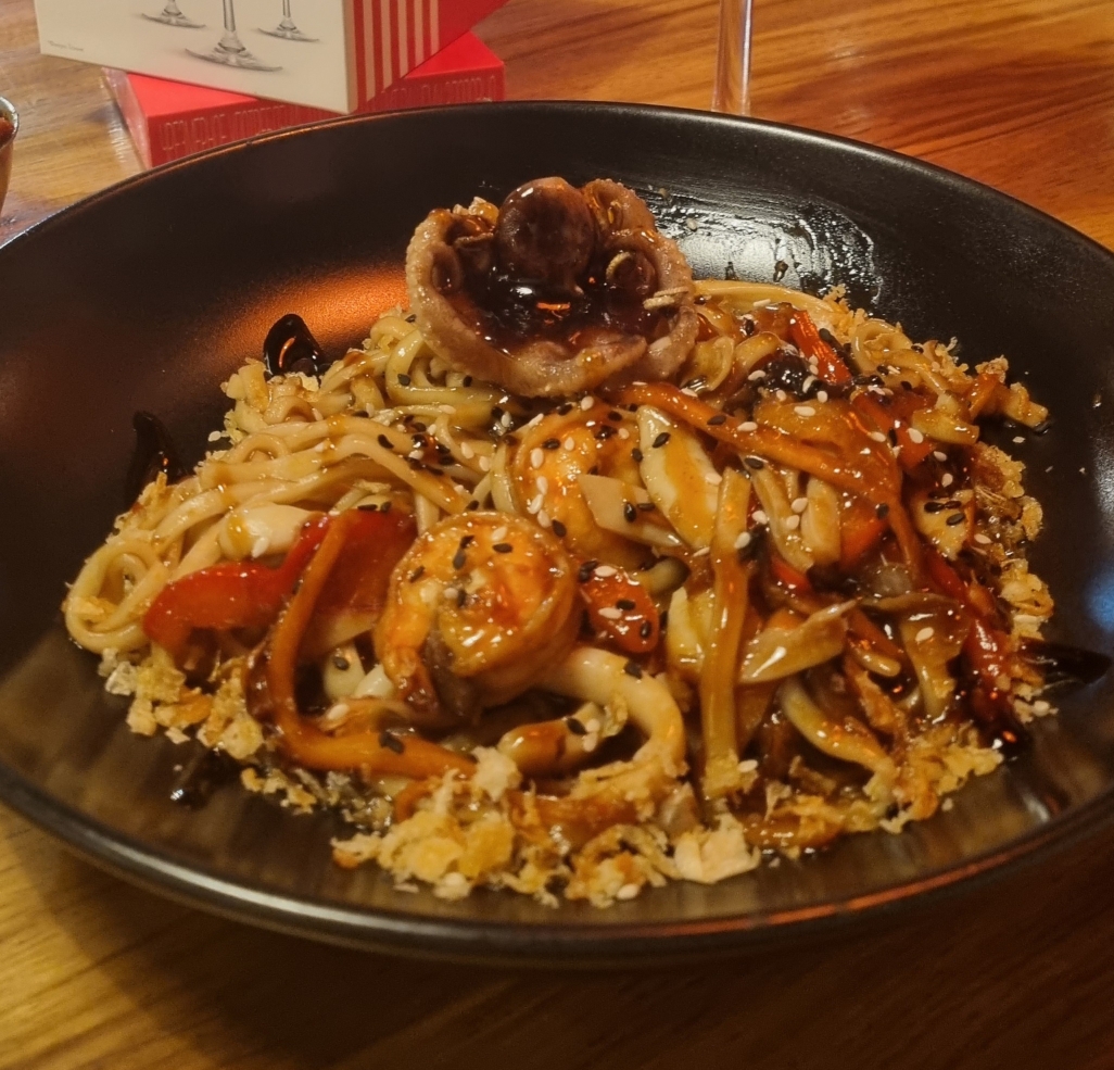 Острый пряный тайский суп с тигровыми креветками, кальмарами, грибами с добавлением кокосового молока